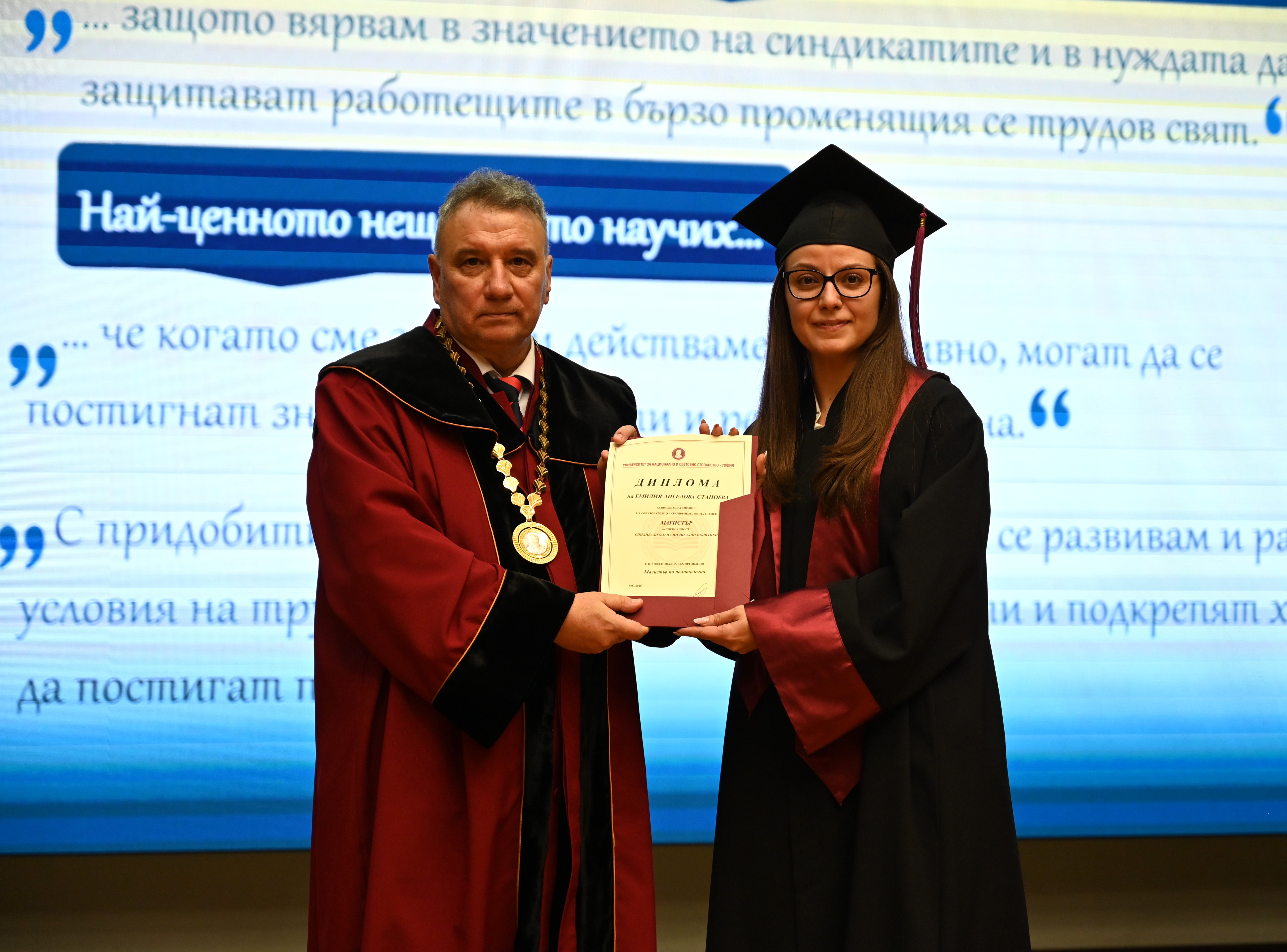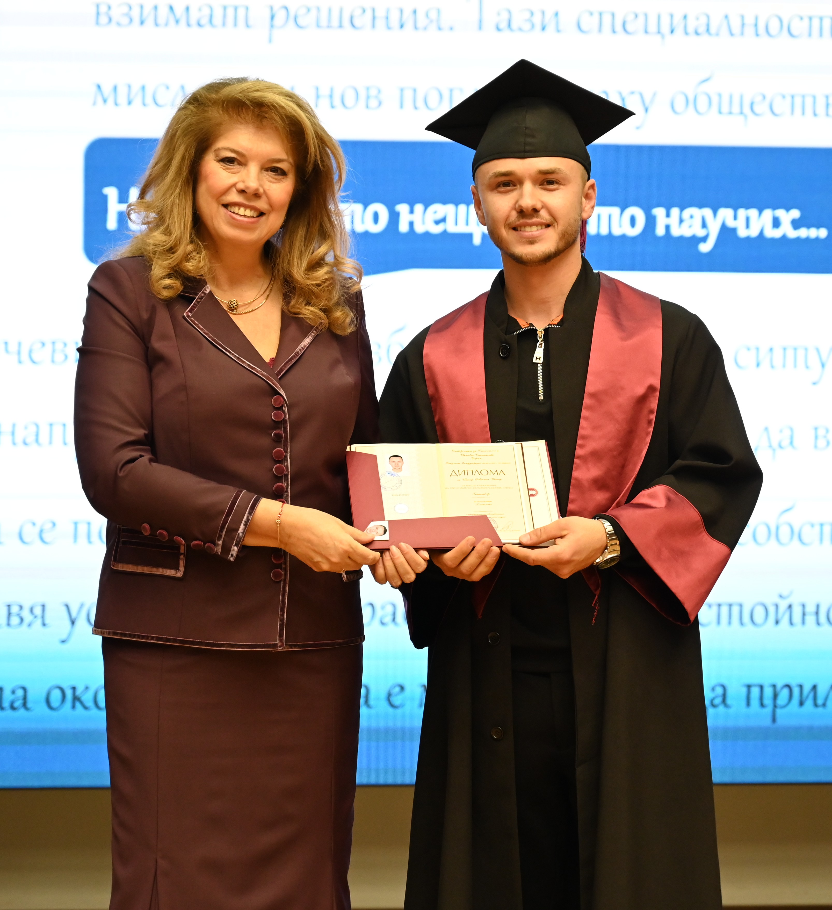 „Скъпи абсолвенти, вие държите огромна отговорност – анализът на света, в който всички живеем“, обърна се към дипломантите вицепрезидентът Илияна Йотова и допълни: „Трябва да защитавате идеите си, да ориентирате общественото мнение. Затова се изискват много знания, които съм сигурна, че университетът ви е дал. УНСС ви даде базата – пазете я и я развивайте!“.