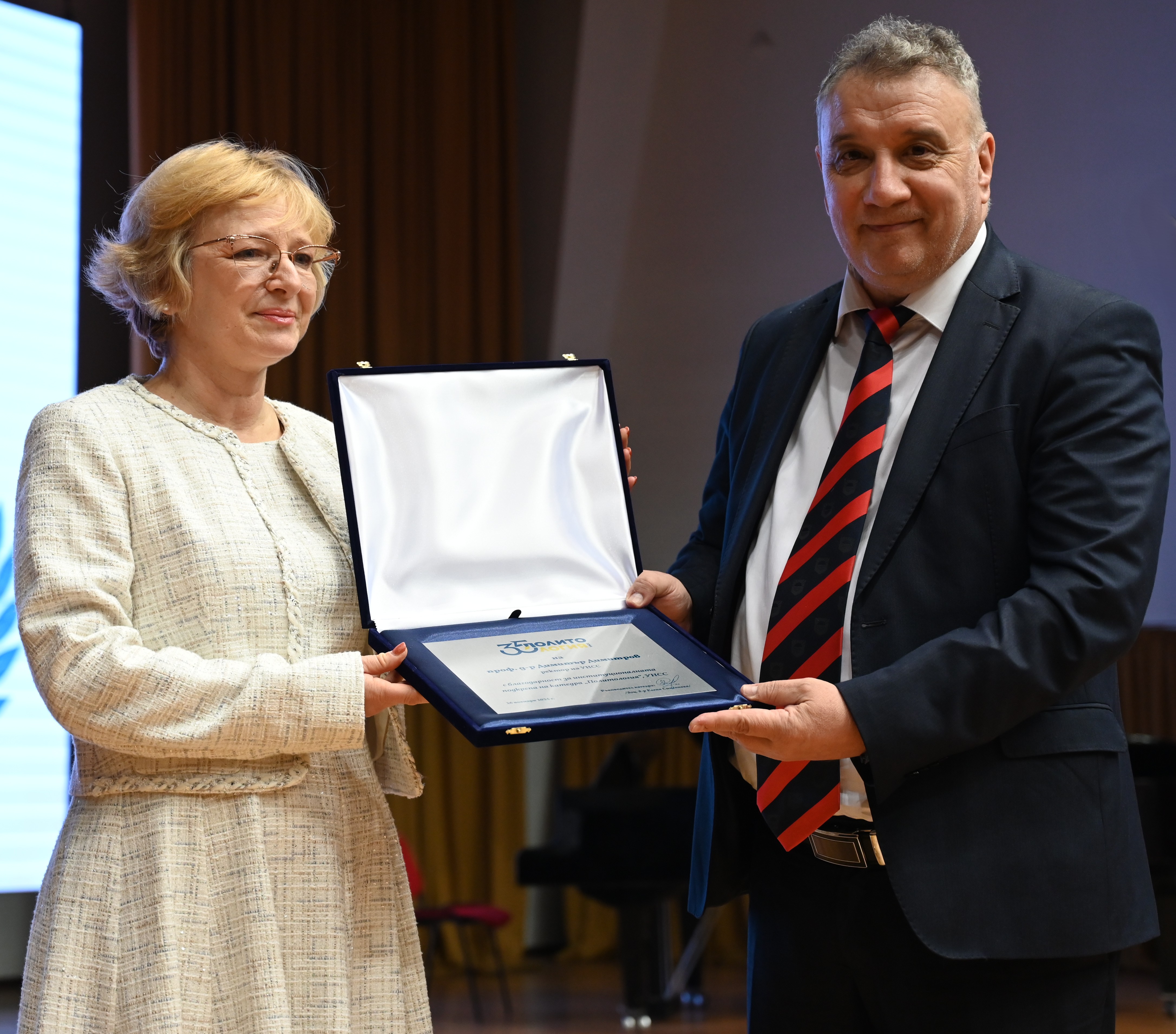 По повод годишнината ректорът проф. Димитър Димитров връчи на доц. Елена Симеонова статуетка на основателя и първи ректор на УНСС проф. Стефан С. Бобчев.