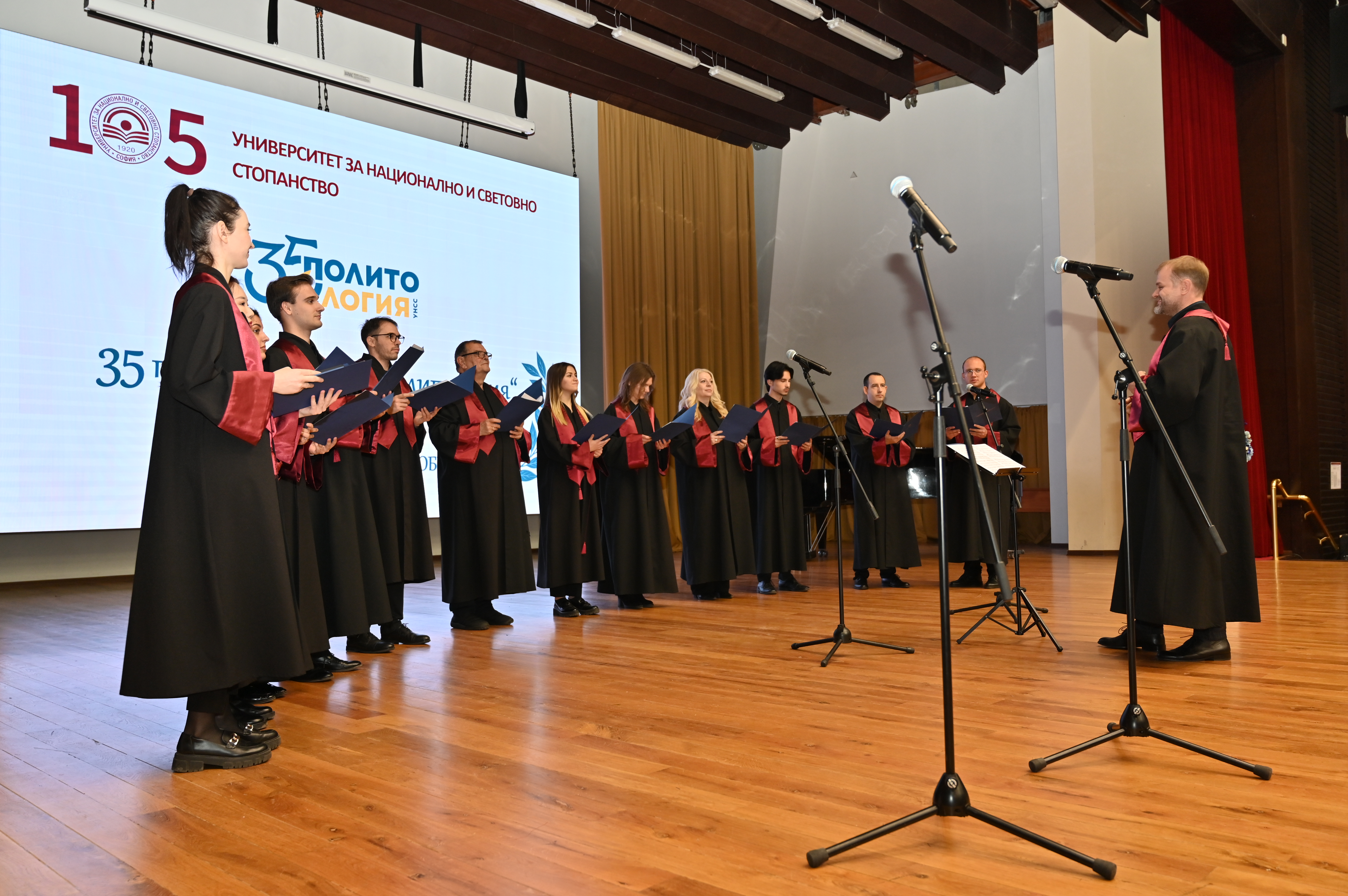 За първи път на церемонията по връчване на дипломите зазвуча и химнът на политолога, чийто текст е написан от доц. Елена Симеонова, а абсолвентите казаха клетвите на политолога и на синдикалиста.