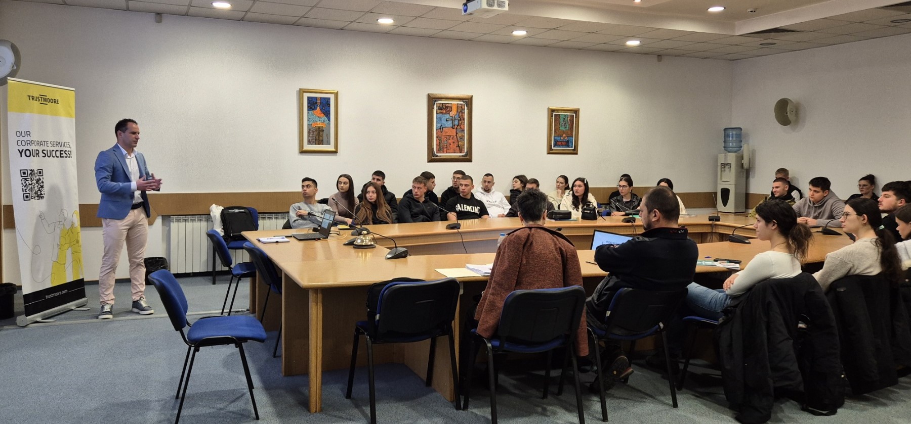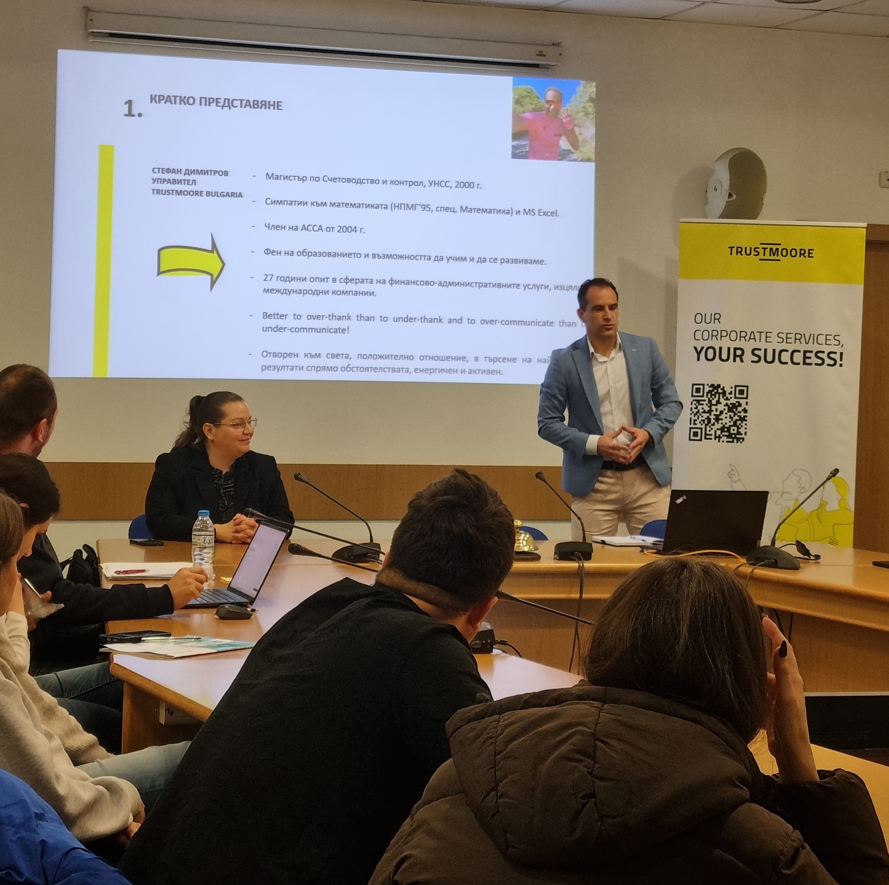 Стефан Димитров – управляващ директор в българското подразделение на компания TRUSTMOORE, бе гост лектор. Той сподели ценни и практични съвети за цялостния процес по подбор на кандидати, за изграждането на доверие и за възможностите младите хора, които тепърва започват своята професионална кариера, да представят най-добрите си качества на потенциалните работодатели.