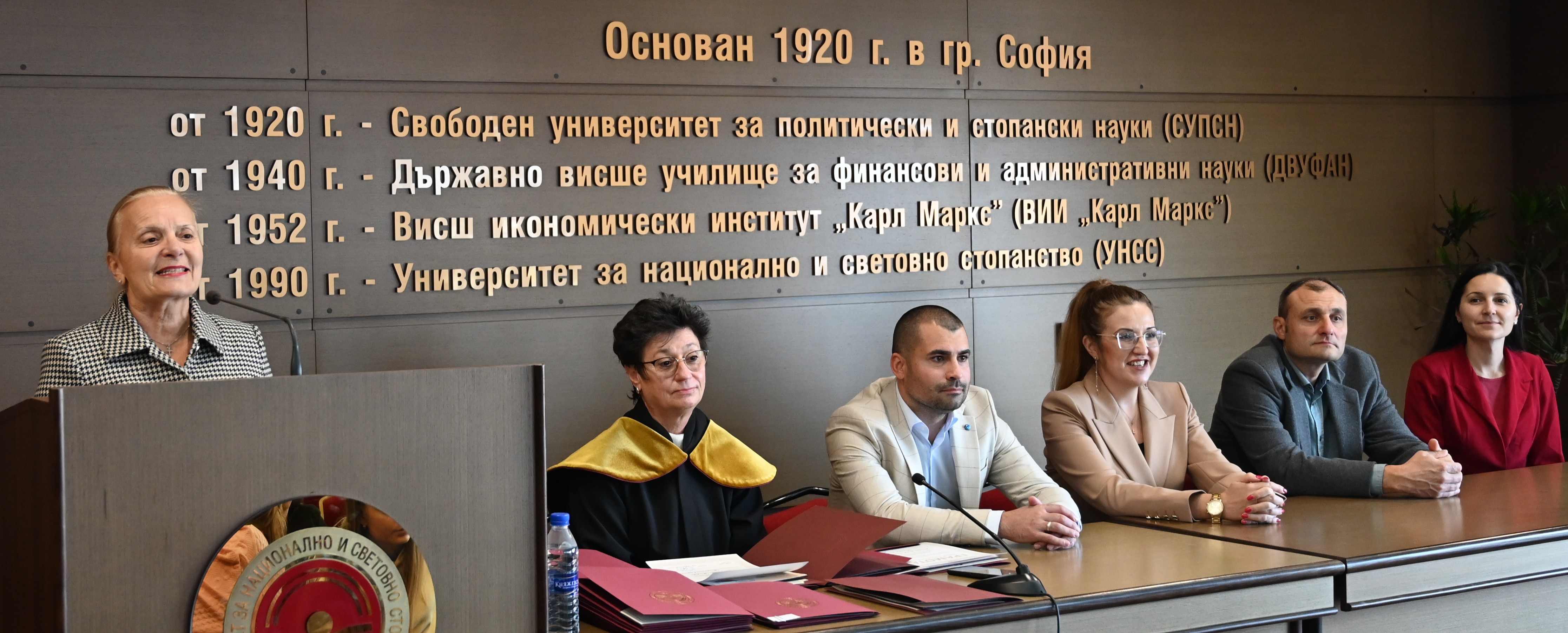 „Скъпи дипломанти, скъпи преподаватели, родители и близки. За мен е чест да присъствам на това мило тържество, това е един незабравим ден както за вас, колеги, които сте се дипломирали, така и за вашите семейства. Това е един много важен етап от вашето развитие, от вашия живот. На бакалаврите пожелавам да продължат в образователна и квалификационна степен „магистър“, а на магистрите да запишат докторантура. Пожелавам ви на добър час във вашите бъдещи стъпки и не забравяте, че сте част от голямото семейство на Университета за национално и световно стопанство“, обърна се към абсолвентите деканът на факултета.