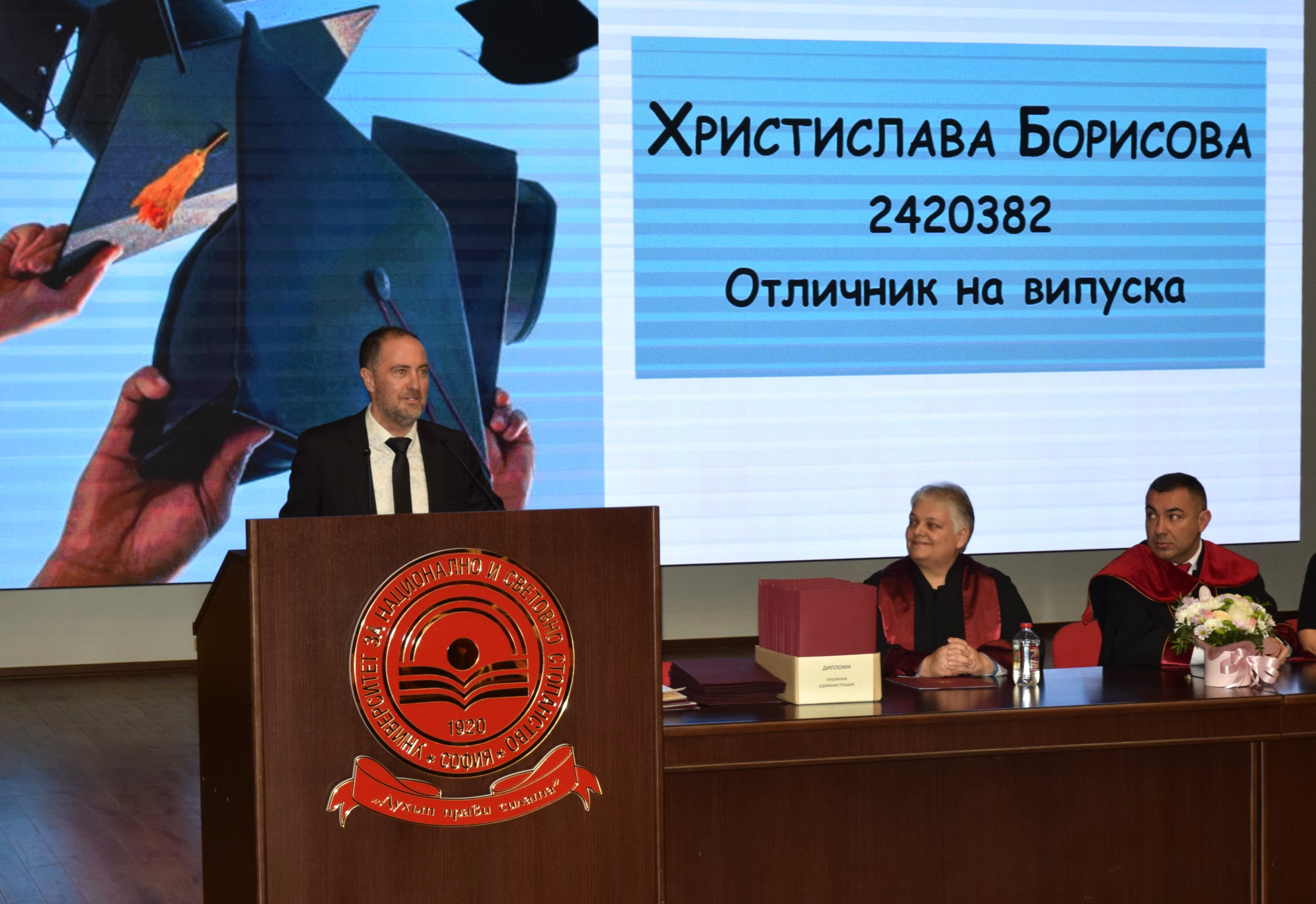 Заместник-ректорът по международна дейност доц. д-р Янко Христозов поздрави абсолвентите като отбеляза, че тази церемония се случва в една много интересна седмица – седмицата на публичната власт, на публичните финанси, на публичната администрация. „Да поздравим виновниците за това вие днес да сте в тази зала. На първо място, това са вашите родители и роднини, които са ви подкрепяли. Следват вашите преподаватели и вие самите, които положихте изключително големи усилия“, каза доц. Христозов.