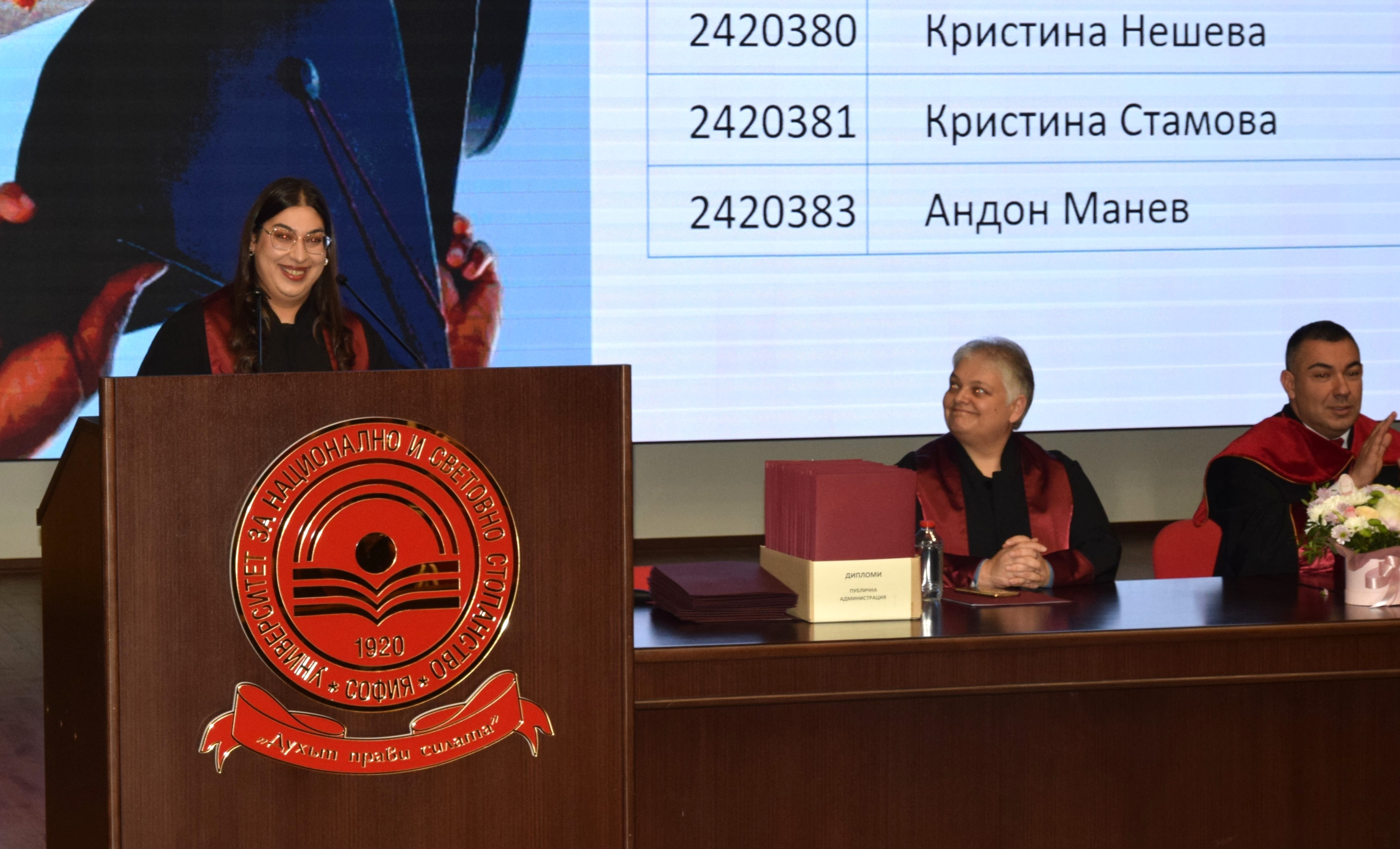 „Днес не е просто финалът на нашето академично приключение, а началото на нещо ново. Оттук нататък ще покажем моралните ценности и всички уроци, които научихме през годините на обучението си тук. С искрена благодарност и дълбоко уважение искам да се обърна към нашите преподаватели, без които този път нямаше да бъде същия. Благодаря ви за високия академичен дух, за вдъхновението, за безценните уроци, които ни дадохте и ни научихте да бъдем мислещи хора“, каза Христислава Борисова (на снимката долу) и изрази увереността си, че придобитите в университета знания ще отворят много врати пред завършилите студенти.