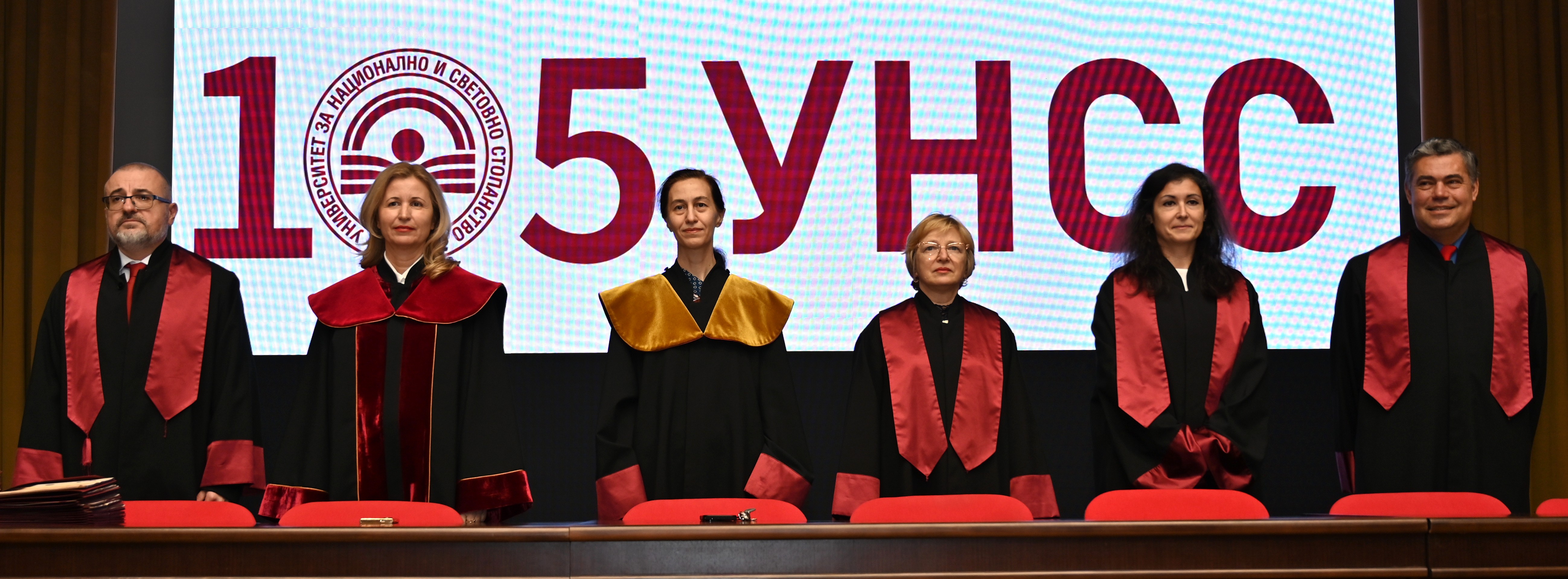 Доц. д-р Пламен Ралчев откри церемонията и поздрави студентите за успешното им дипломиране: „Днес е тържествен миг за всички вас. Надявам се, че този ваш успех ще бъде началото за нови още по-големи успехи. УНСС е трамплин, който ще ви оттласне нависоко и надалече, защото знам, че всички вие имате огромни възможности“.
