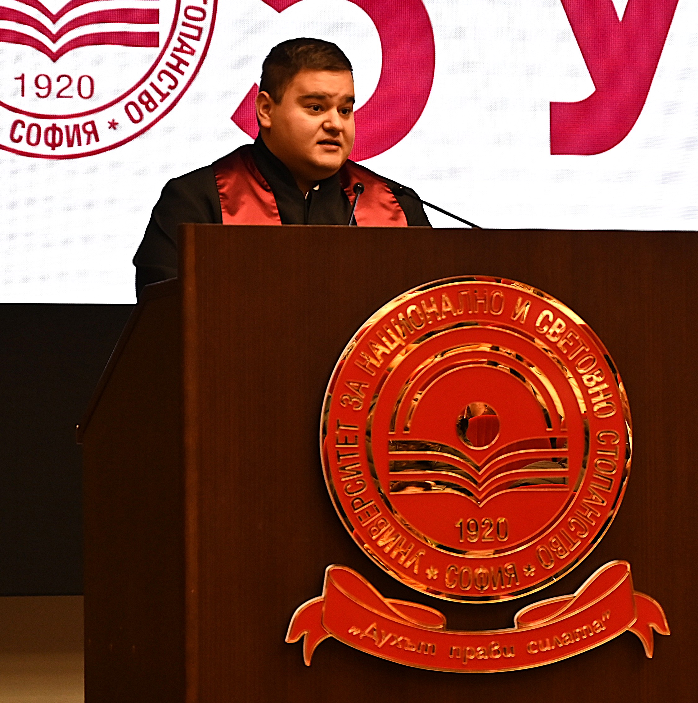 От името на студентската общност с приветствие към дипломантите се обърна Тодор Драганов, магистър „Дипломация и стратегически анализ“. „Днес получаваме не само диплома, а отговорност. Отговорността и решенията ни водеха през тази година. В УНСС научихме да поставяме въпросите критично, да премисляме и анализираме. Смея да кажа, че днес сме готови да навлезем в професионалния свят. Успехът се гради от нас, ние сме тези, които трябва да изградим един по-добър свят на международните отношения, свят, в който хората се уважават“, каза той и благодари на преподавателите, на своите състуденти и на родителите, които са ги подкрепяли през целия път дотук.