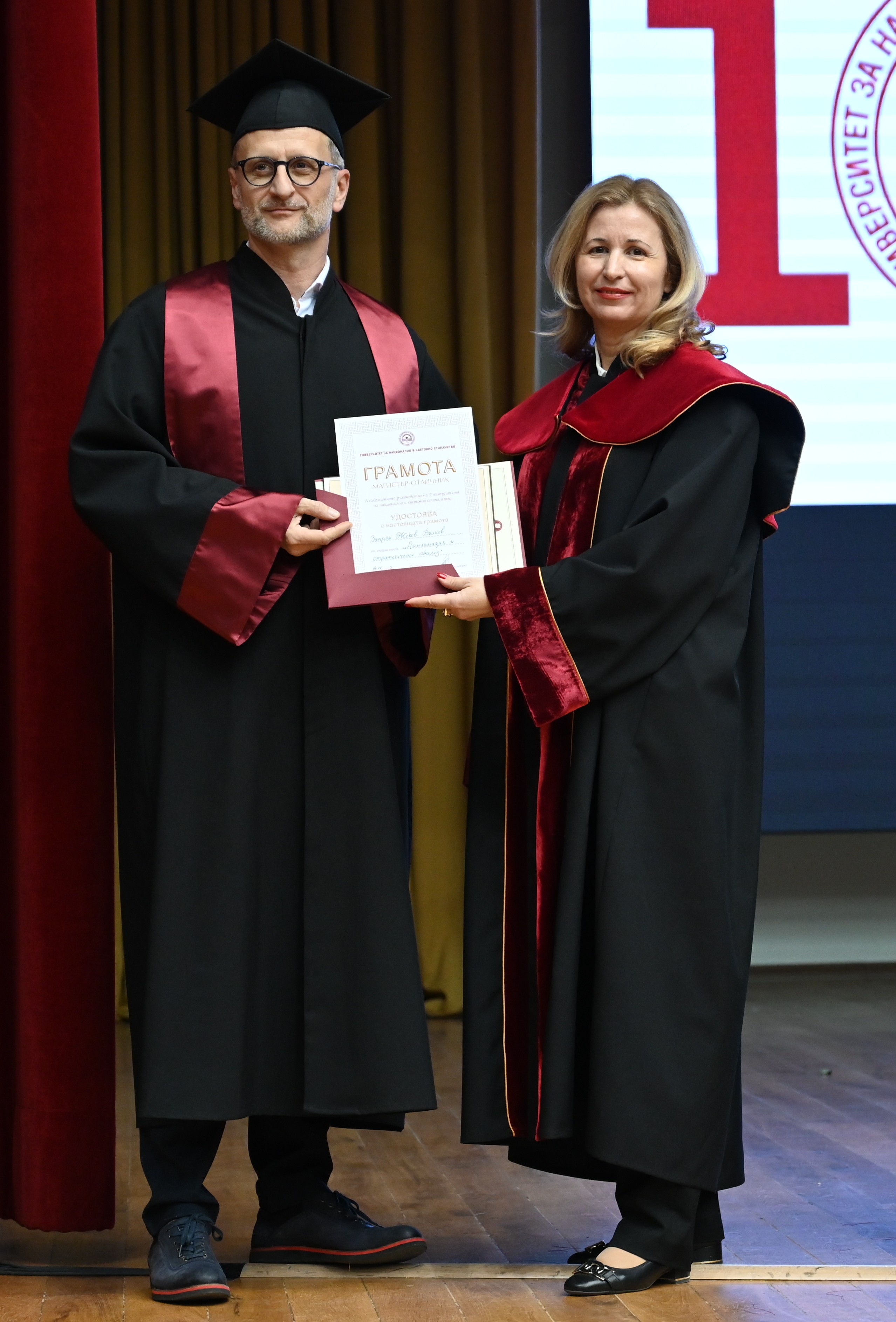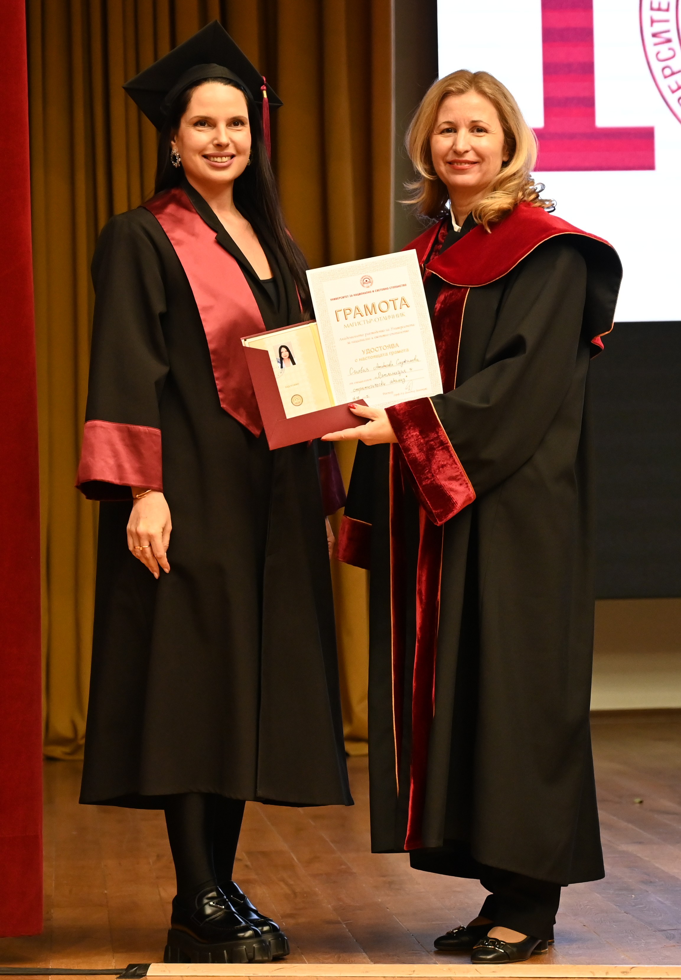 По време на церемонията бяха наградени и двамата магистри, които вече са приети в докторската програма на катедра „Международни отношения“ – Силвия Сиджимова и Запрян Вълков, които получиха своите дипломи от зам.-ректора проф. д-р Цветана Стоянова.