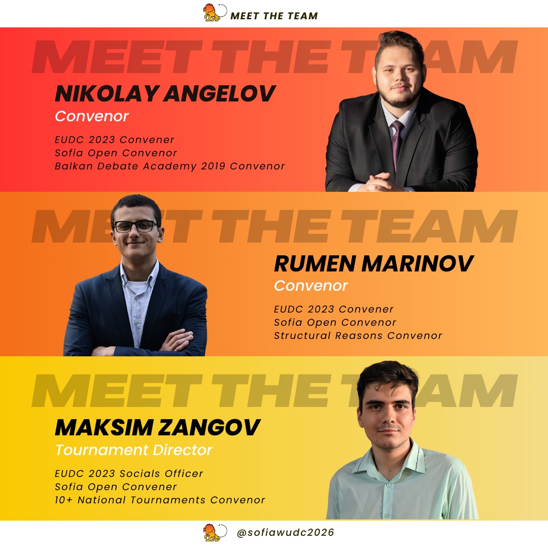 В основата на домакинството стоят личните постижения на нашите състезатели, които прославят страната на Световното първенство в Мадрид, 2023 г. и на Европейското състезание в Бургас през 2023 г., като по този начин печелят възможността да „пренесат“ сцената на дебатите в България. Николай Ангелов и Румен Маринов са финалисти на Световното първенство в Мадрид, като Румен е наш алумни студент, завършил „Бизнес икономика“. Те, заедно с Максим Зангов, са част от организаторите на Sofia World Universities Debating Championships (WUDC) 2026, което ще се проведе от 27 декември до 3 януари в София, а УНСС ще бъде негов домакин. Събитието има дълга история, провежда се от 1980 г. и е във формат британски парламентарен дебат.