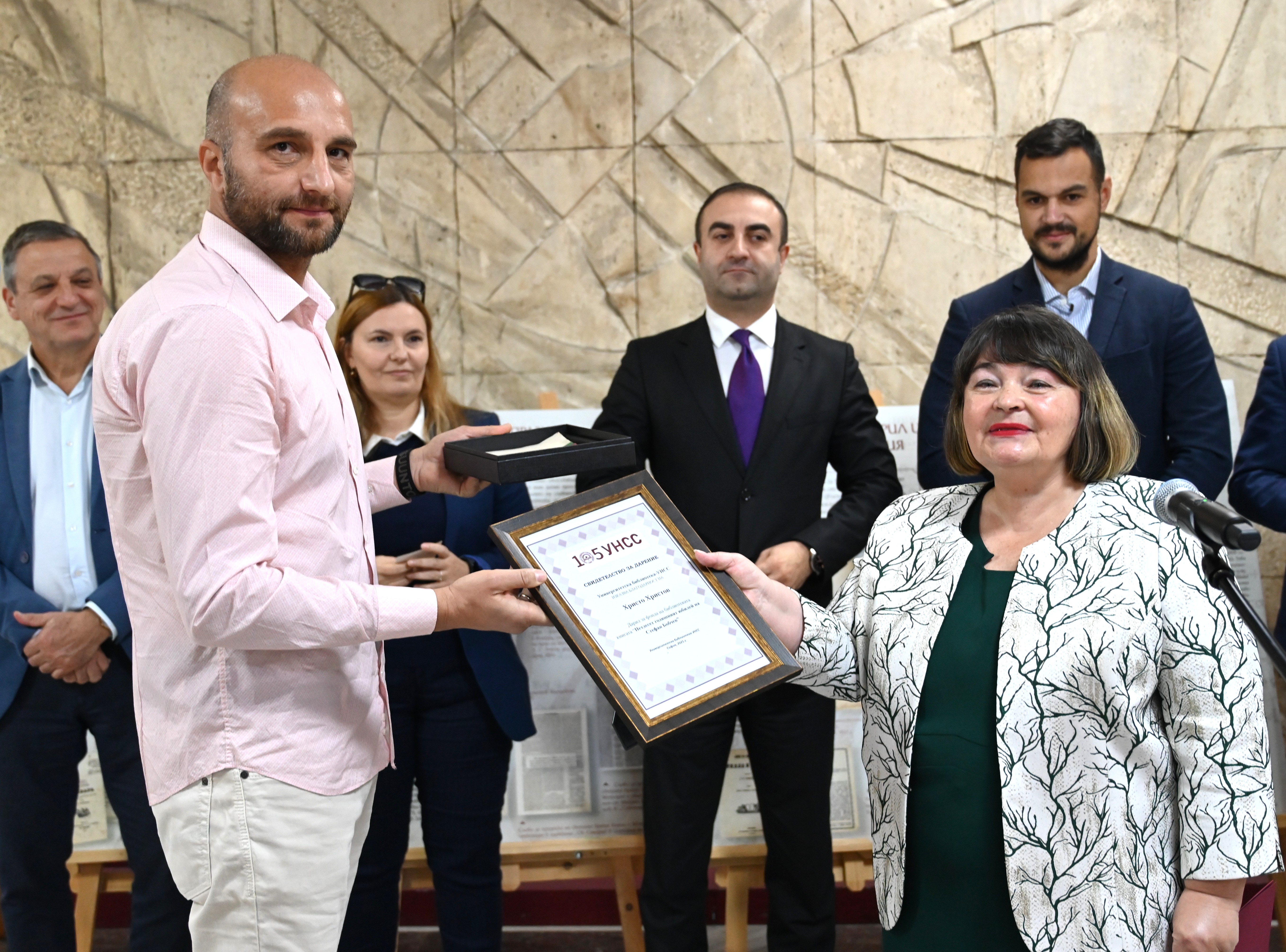 | Проф. Матилда Александрова връчва Свидетелство за дарение от името на Университетската библиотека на Христо Христов, в знак на признателност за неговия благороден жест |