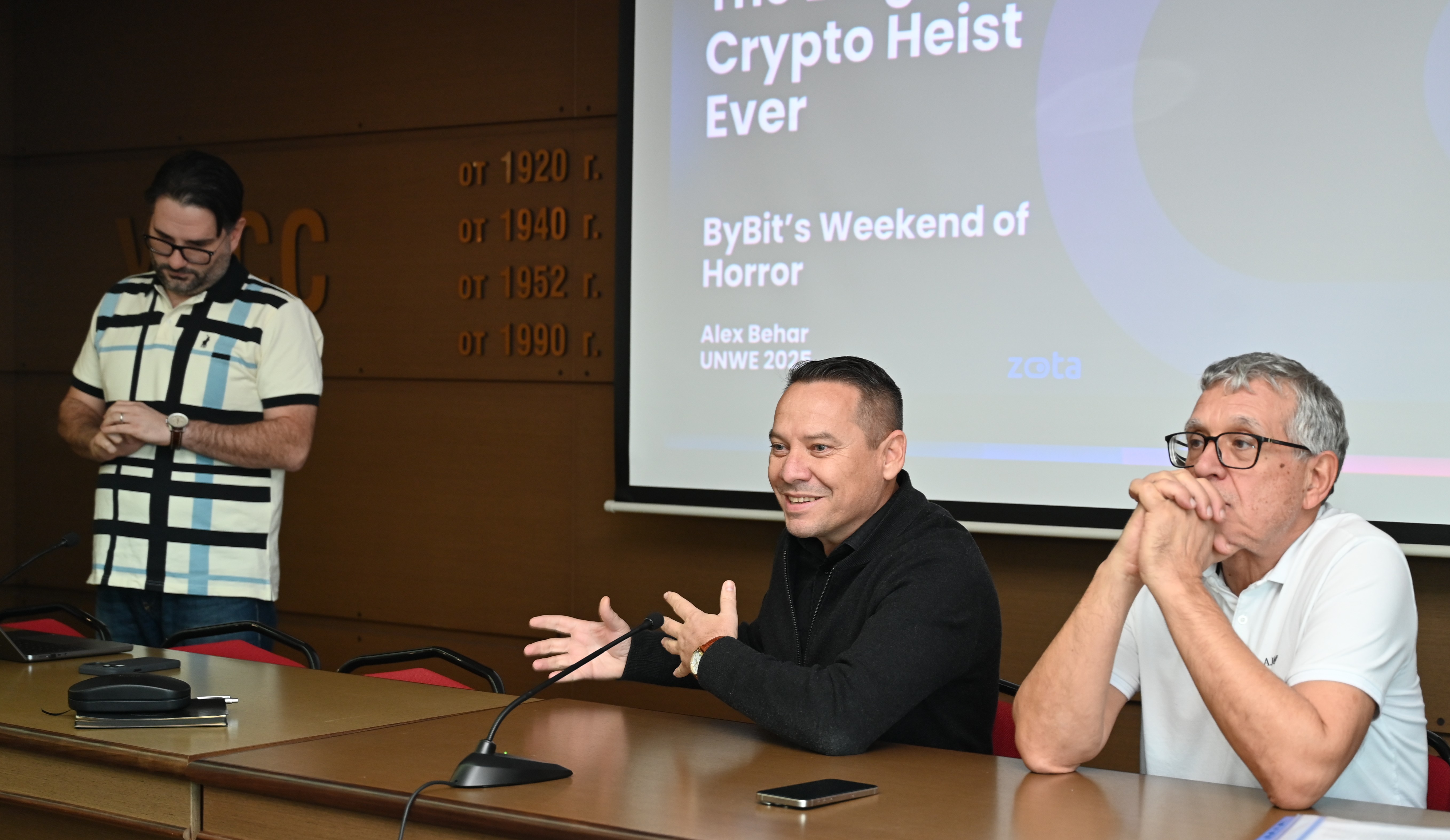 В препълнената зала „Тържествена“ се състоя публична лекция на Алекс Бехар, хоноруван преподавател по киберзащита и управление на кризите в нашия университет и главен информационен директор на Zotapay (глобална компания за разплащателни услуги) на тема „ByBit’s Weekend of Horrror – The Largest Crypto Heist Ever“.