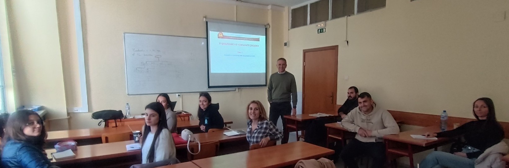 Д-р Любомир Терзиев представи теориите по управление на човешките ресурси и някои практики, прилагани във водещи международни фирми от авиацията, технологичните компании, енергетиката и други. Получиха се „живи“ дискусии, като студентите проявиха най-голям интерес към оценяването на трудовото представяне, заплащането и равните възможности.