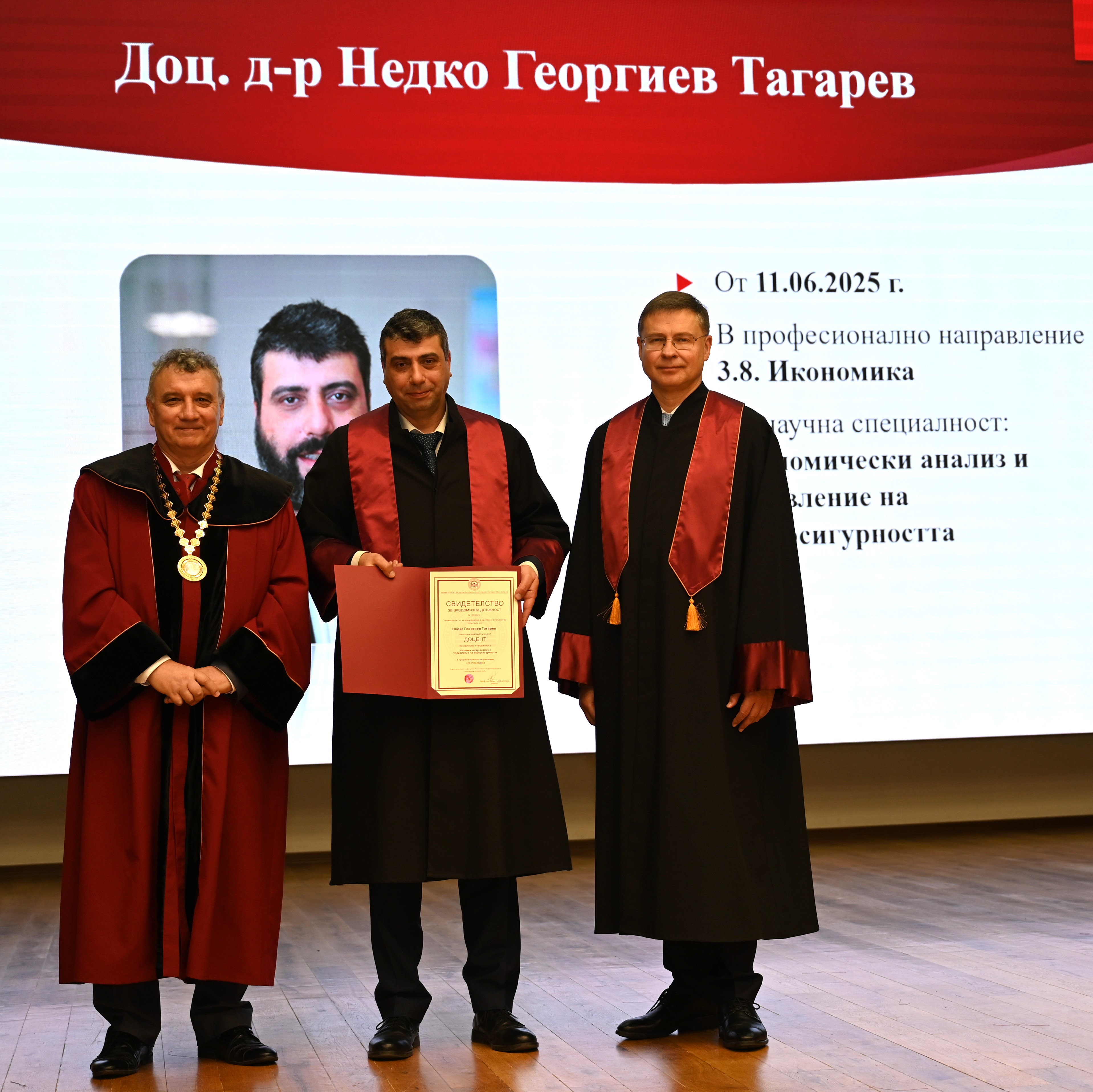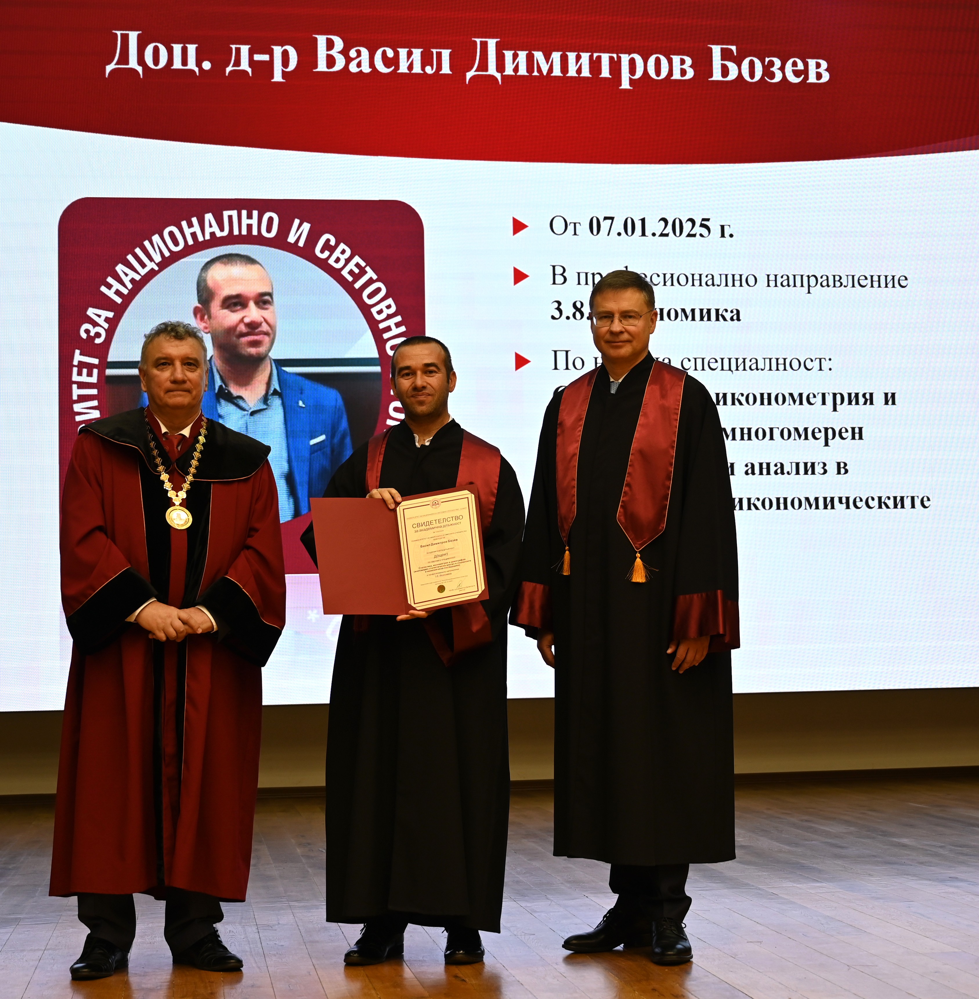 изказа благодарност към г-н Валдис Домбровскис и сподели, че за него е голяма чест да получи сертификата си именно от него. Посочи, че връзката му с УНСС датира от 1998 г., когато е започнал втората си магистратура, и вече близо три десетилетия е свързан с университета. Изрази признателност към колегите от катедра „Национална и регионална сигурност“ и от факултета за оказаната подкрепа, както и към дъщеря си Габриела, присъстваща в залата.