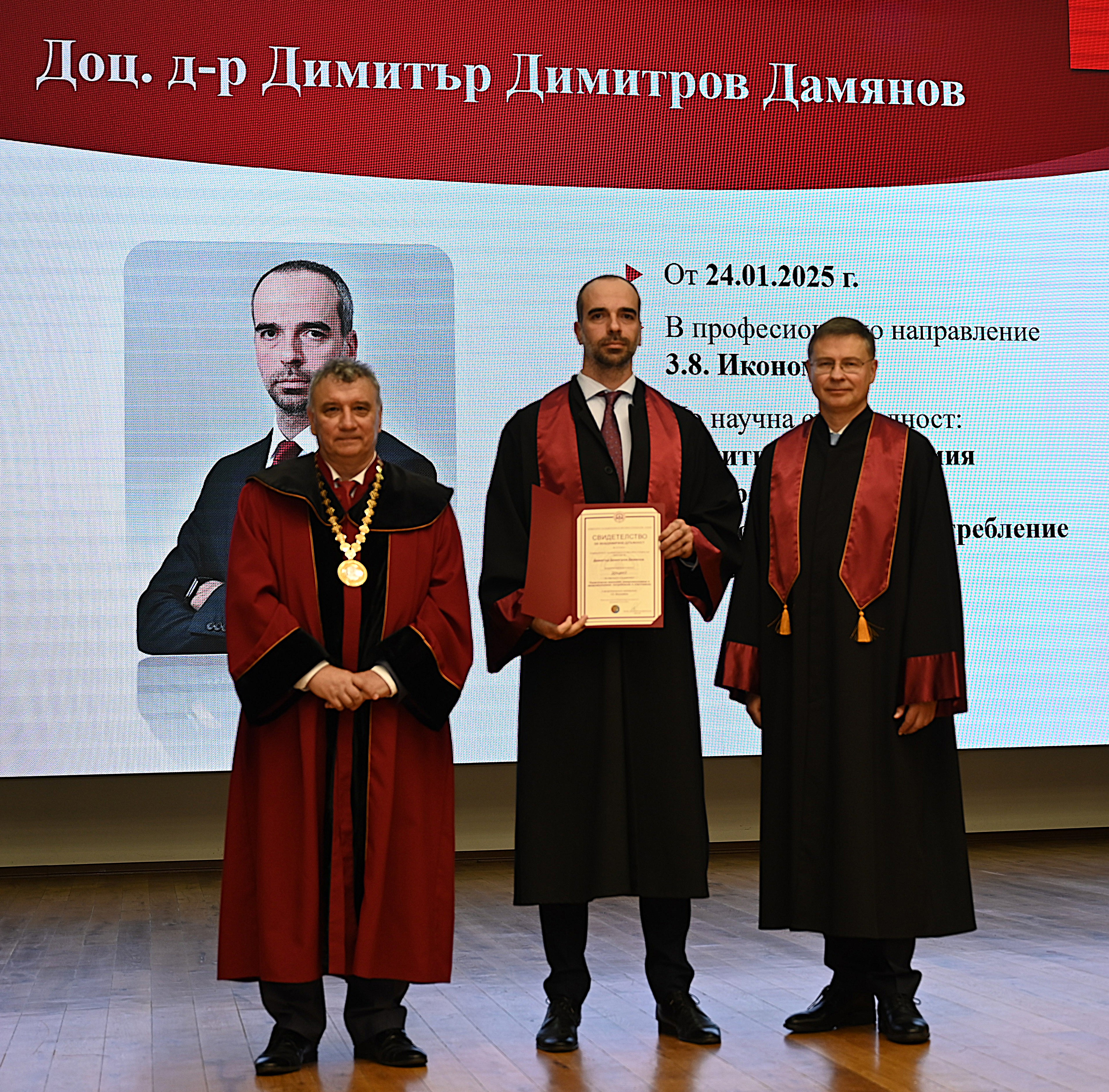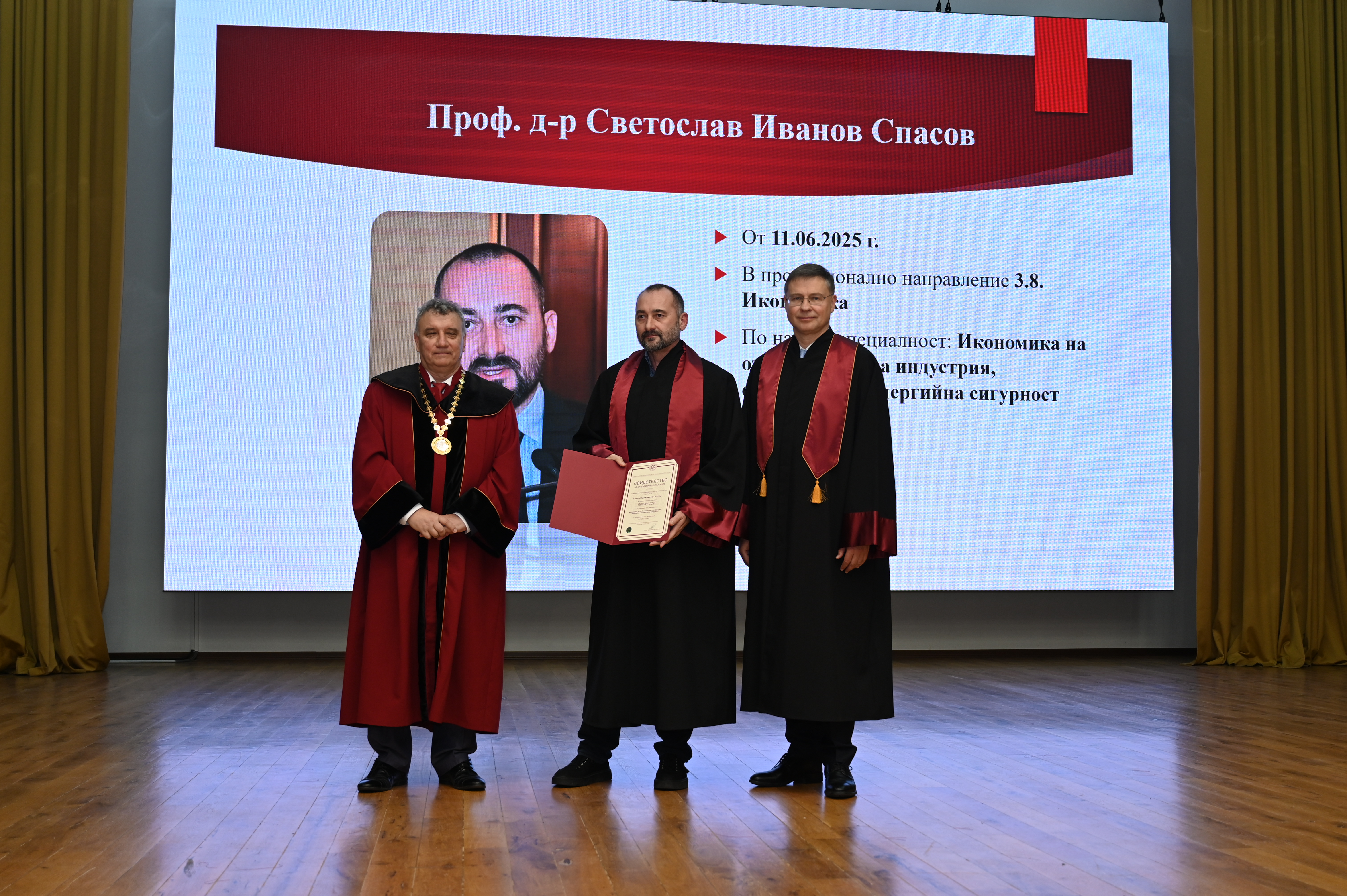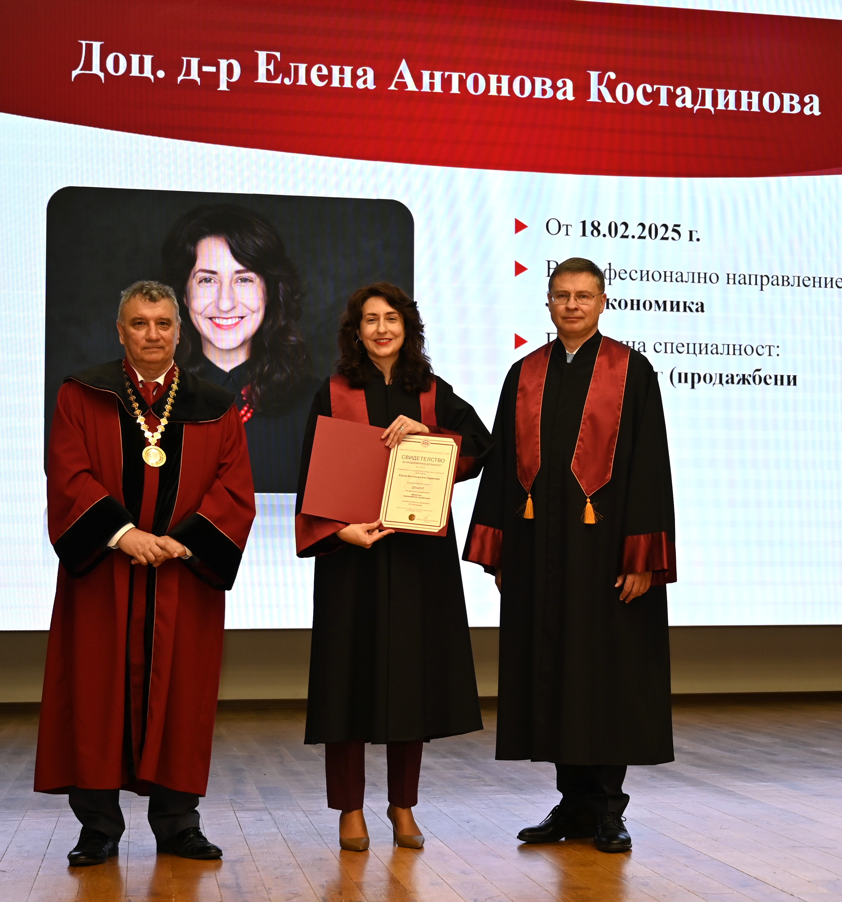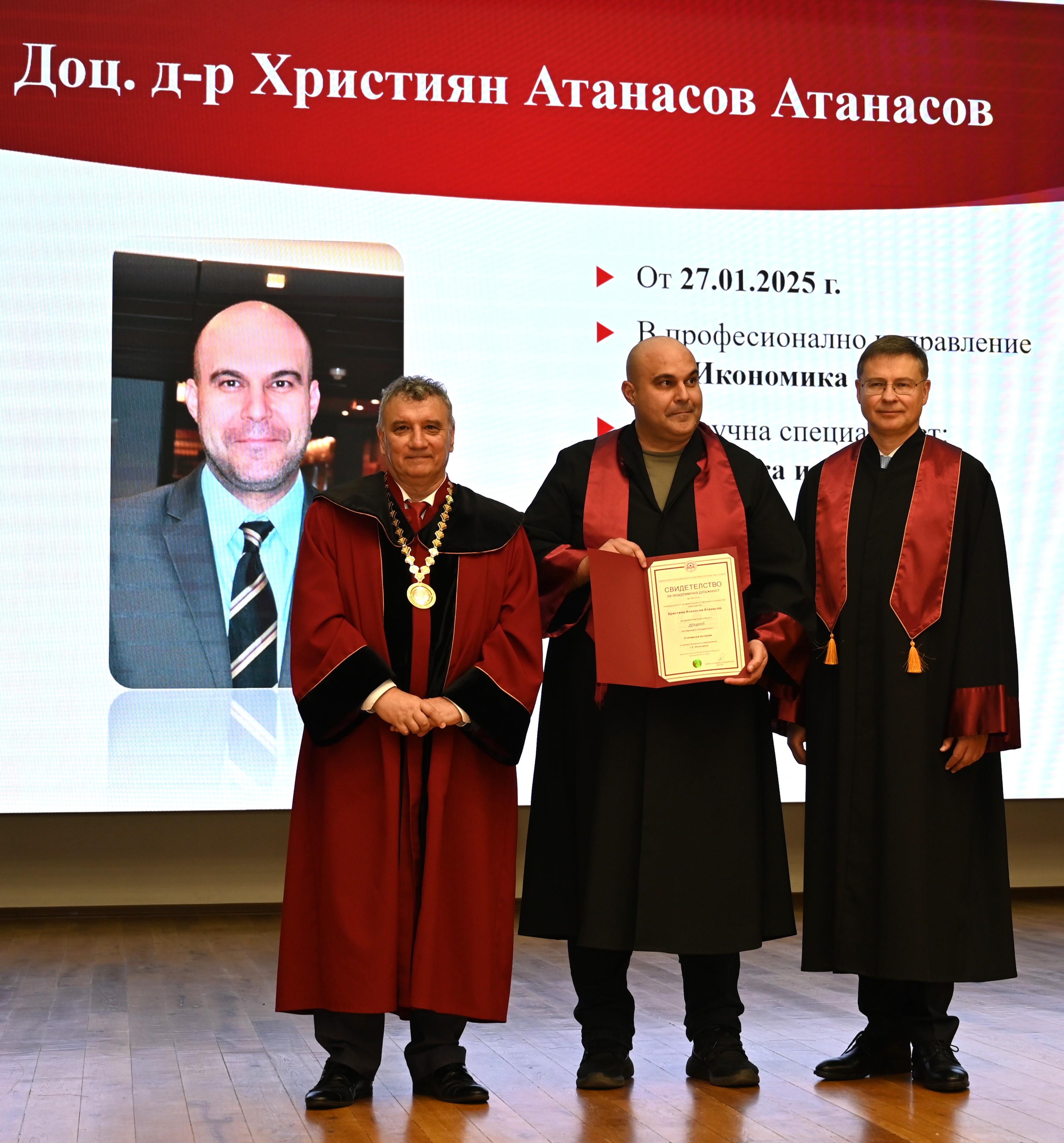 благодари за оказаното доверие и признание, като подчерта, че получаването на свидетелството има дълбоко лично значение. Сподели, че това не е просто личен успех, а израз на отговорност към университета, преподавателите и цялата академична общност. Отбеляза, че зад този момент стоят години труд, подкрепа от семейството, колегите и приятелите, както и активно сътрудничество на национално и европейско равнище. Завърши с уверение, че ще продължи да работи всеотдайно за доброто на университета.