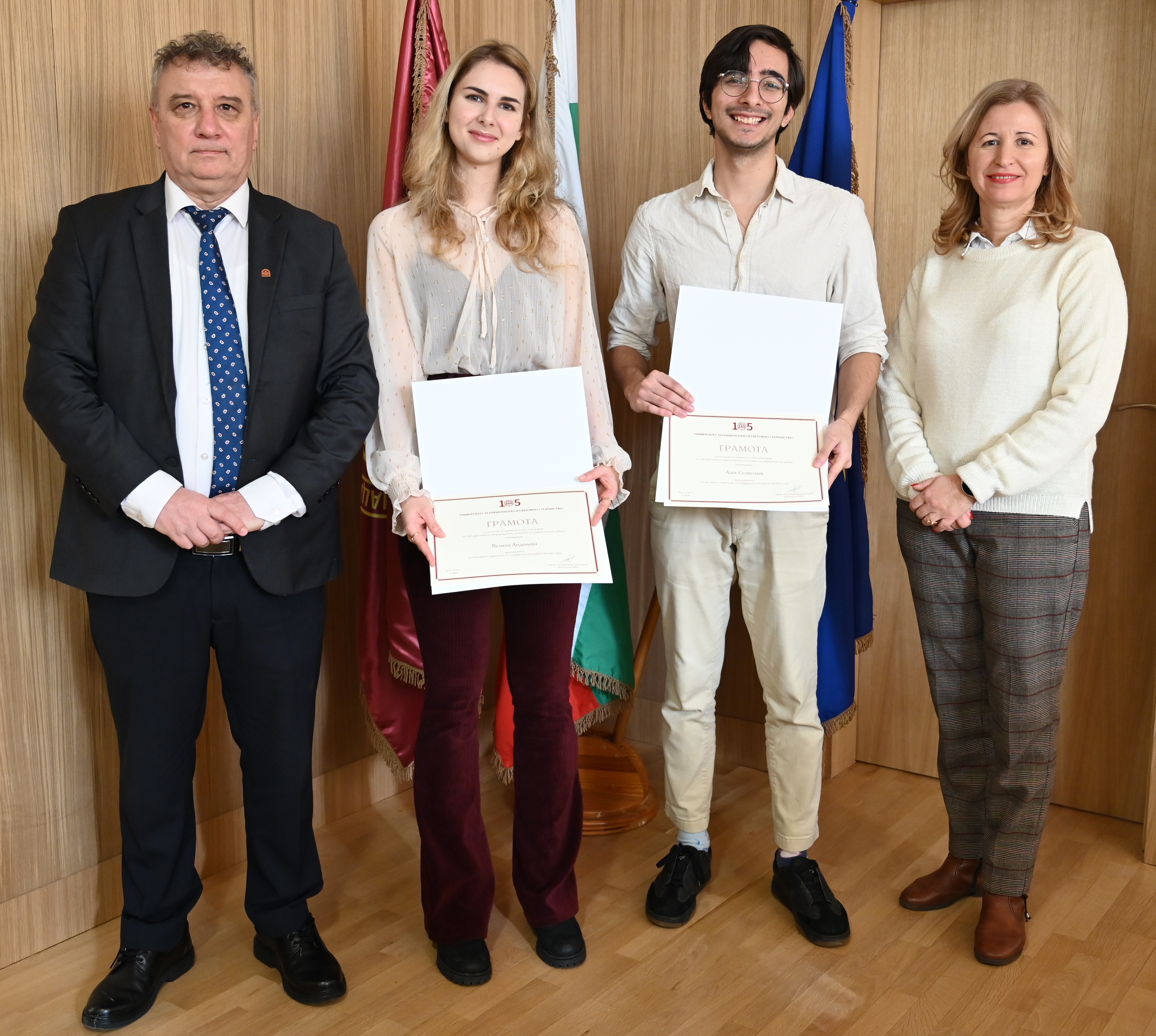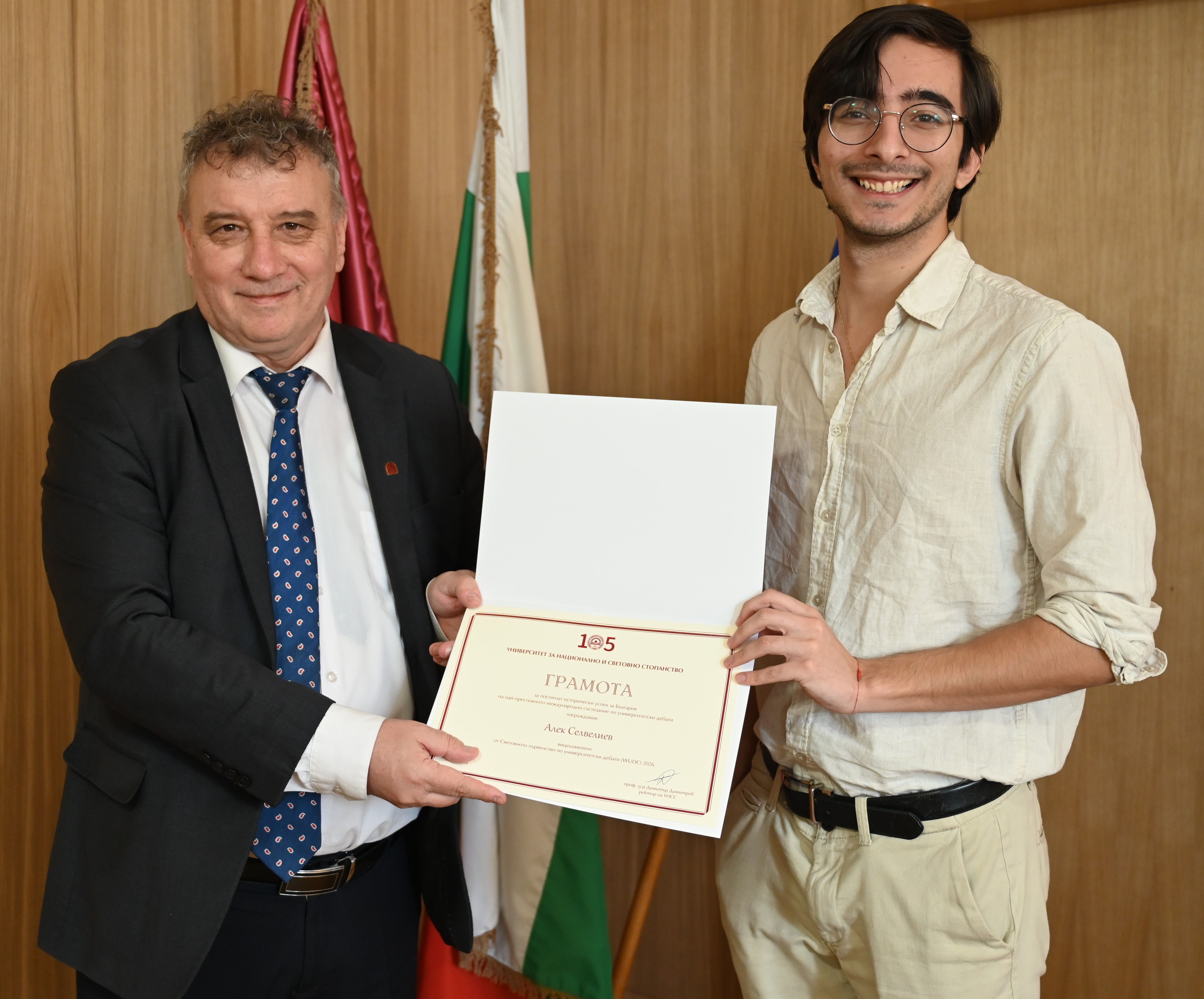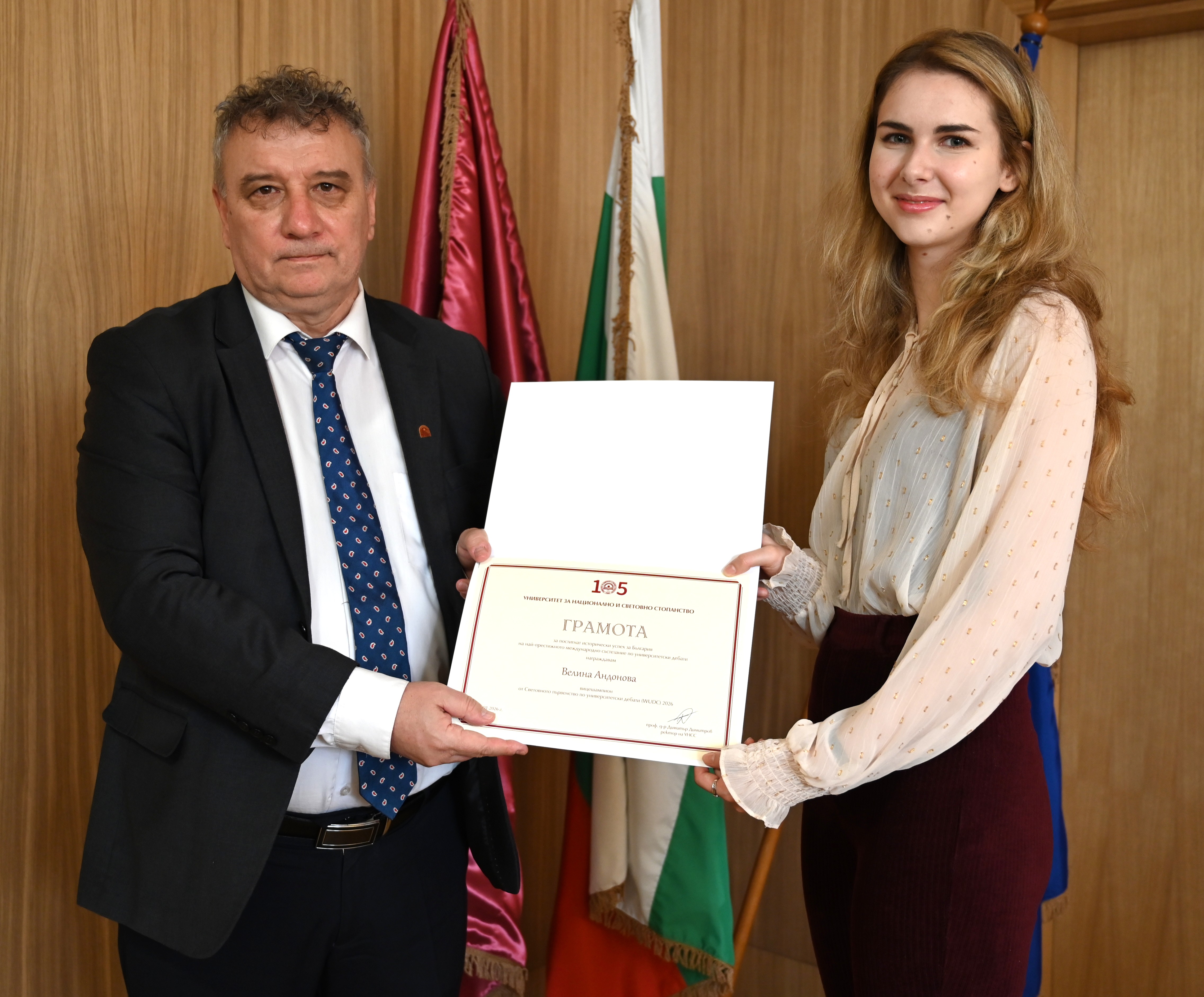 Velina Andonova and Alek Selveliev expressed their gratitude to Prof. Dimitrov and the University Management: “It is a great honor for us to receive this recognition. We are grateful for the support and attention given to debates as a form of education that develops critical thinking, responsibility, and active citizenship”.