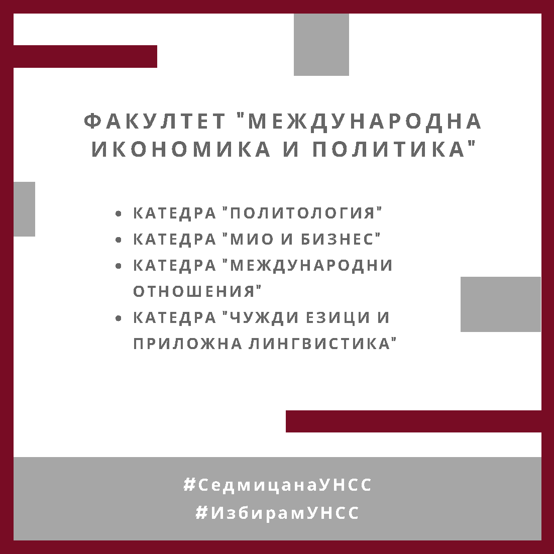 Запознайте се с нашите специалности. Предлагаме Ви виртуално да се срещнете със студенти, с които се гордеем и с ярки представители на общността на завършилите УНСС, както и с ръководството на Университета и с преподавателите, за да научите от първо лице предимствата на обучението в нашия университет.